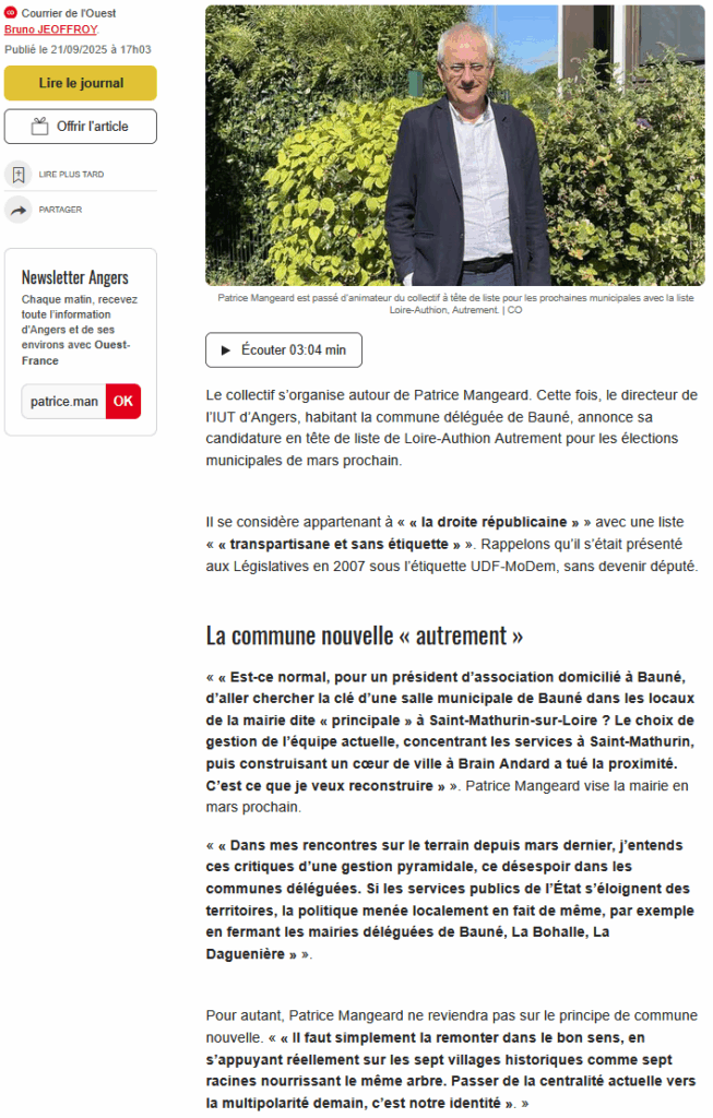 Article du Courrier de l’Ouest du 7 octobre 2025 : déclaration officielle de notre campagne électorale